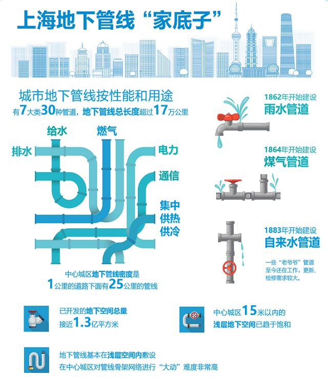 市政管線(xiàn)是城市的生命線(xiàn)。目前上海地下管網(wǎng)按性能和用途已有給水、排水、燃氣、電力、通信、集中供熱供冷等7大類(lèi)30種管道,地下管線(xiàn)總長(cháng)度超過(guò)17萬(wàn)公里??傮w而言,上海的地下管線(xiàn)建設和管理一直處于全國領(lǐng)先水平。