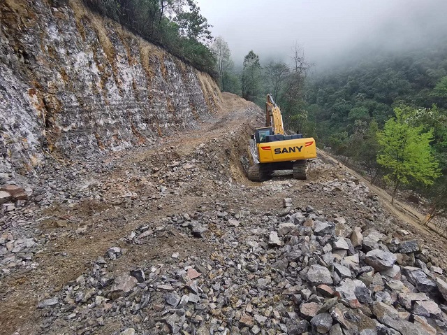 圖為河池市生態(tài)環(huán)境局指導項目實(shí)施方對三鏡巖溶洼地開(kāi)展進(jìn)場(chǎng)道路修建。