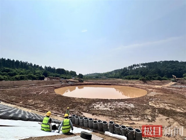 5月27日上午,楊下調蓄池建設現場(chǎng)的施工氛圍與天氣一樣火熱。在3號調蓄池建設現場(chǎng),主體結構已完工,工人們正在進(jìn)行護坡施工。極目新聞?dòng)浾攥F場(chǎng)看到,該調蓄池位于一處丘陵地帶的低洼處,承接周邊大片山地、丘陵來(lái)水。調蓄池不僅能調蓄洪水,日常則可以作為灌溉水庫,為下游數百畝田地提供灌溉水源。