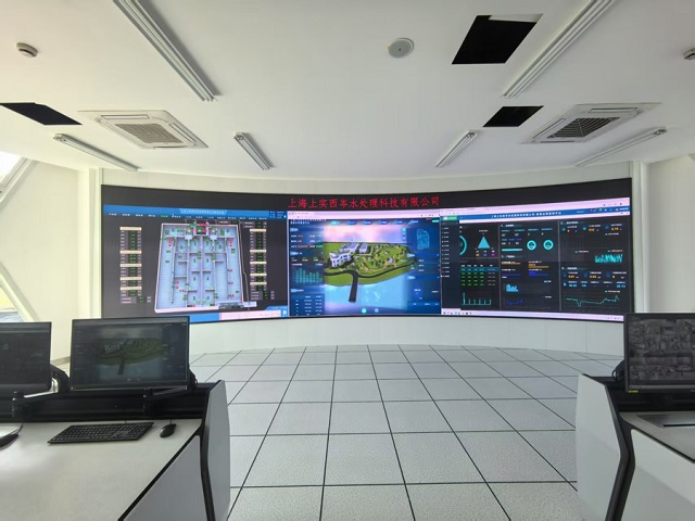 圖為上實(shí)環(huán)境西岑污水處理廠(chǎng)的數字化中控大屏。