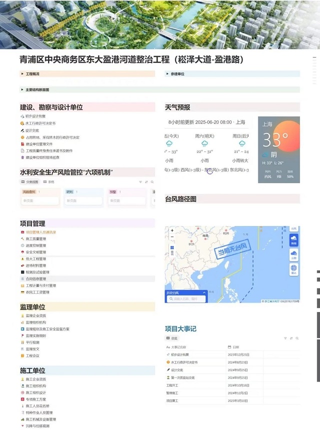 在基坑與閘室結構施工中,項目團隊以“科技興安”理念推動(dòng)安全生產(chǎn)標準化建設,通過(guò)3D建模對施工全流程進(jìn)行全景模擬推演,提前預判風(fēng)險點(diǎn)。自主研發(fā)的“項目全流程監管系統”基于Notion平臺構建,集成質(zhì)量、安全、進(jìn)度等核心數據實(shí)時(shí)監控功能,創(chuàng )新嵌入臺風(fēng)預警、精準天氣預報及AI大模型風(fēng)險分析模塊,實(shí)現從隱患排查到應急處置的全鏈條數字化管控。