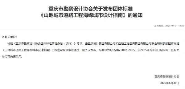 由重慶設計集團有限公司市政設計研究院主編的《山地城市道路工程海綿城市設計指南》于2025年7月30日起實(shí)施。主要內容涵蓋道路海綿指標的確定、計算方法、設施布局、設施設計及植物配置等關(guān)鍵環(huán)節,并針對當前道路海綿城市建設中存在的海綿指標界定不清、設施計算不規范、滯留帶收水效率低及植物景觀(guān)效果欠佳等問(wèn)題提出了差異化解決方案,兼具適用性和可操作性。