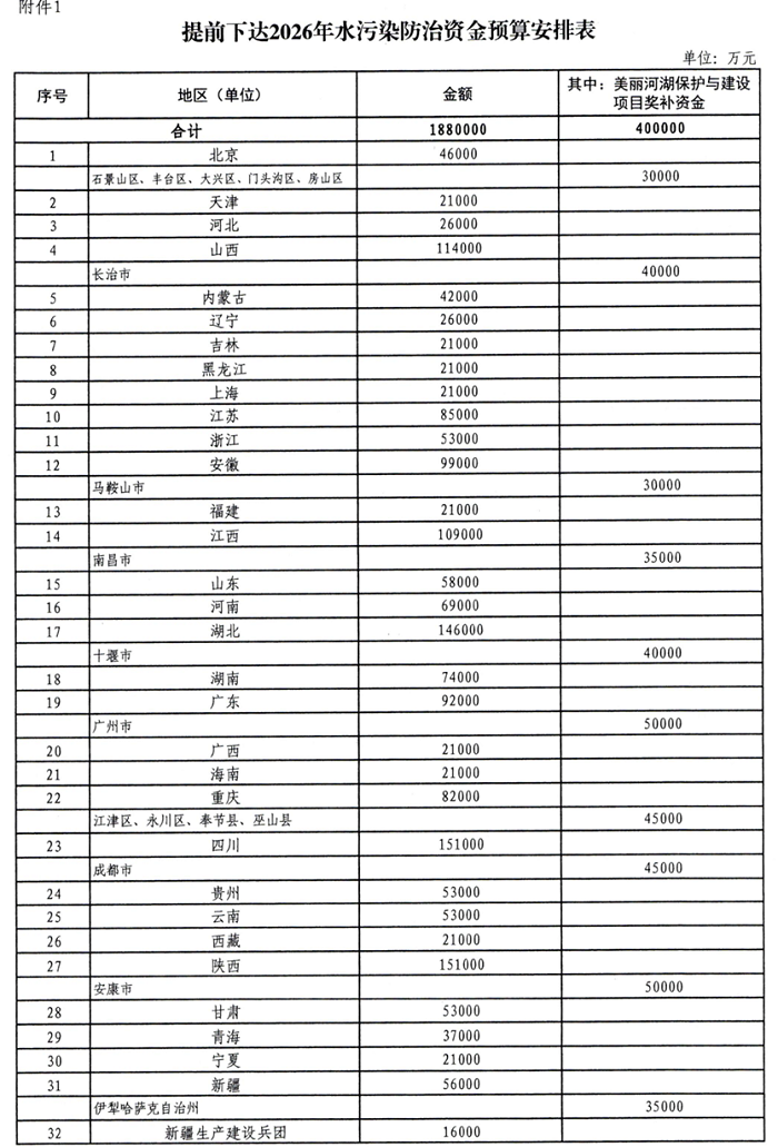為支持水污染防治工作,促進水環境質量改善,現下達你?。ㄗ灾螀^、直轄市、新疆生產建設兵團,以下統稱?。?026年水污染防治資金,用于支持水污染防治和水生態環境保護方面相關工作,并就有關事項通知如下: